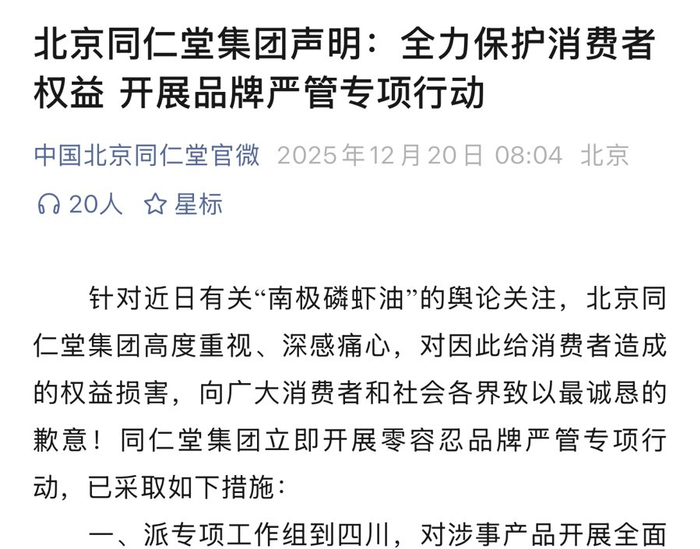 声明表示,针对近日有关“南极磷虾油”的舆论关注,北京同仁堂集团高度重视、深感痛心,对因此给消费者造成的权益损害,向广大消费者和社会各界致以最诚恳的歉意!同仁堂集团立即开展零容忍品牌严管专项行动,已采取如下措施: