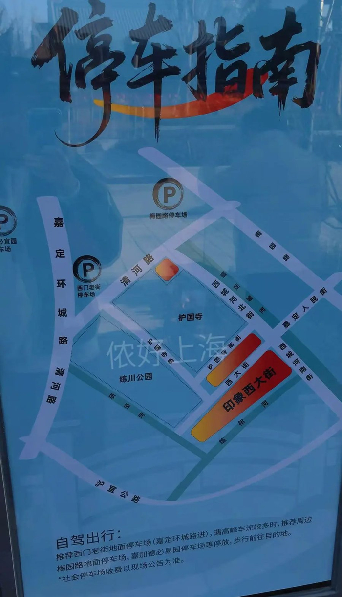 小侬现场看到的停车指南显示:可停西门老街停车场(嘉定环城路进),客流较多的情况下,或引导至梅园路停车场嘉加德必易园停车场。