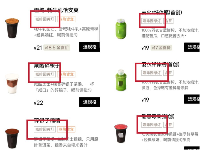 值得一提的是,自去年开始,已有茶饮品牌在菜单上通过“红黄绿灯”来标注咖啡因含量,用“红灯”代表咖啡因含量较高的茶饮。针对本次“奶茶含咖啡因”引发的讨论,业内人士呼吁,不妨在茶饮和咖啡行业推广“红黄绿灯”指示,方便消费者更加直观地了解饮品中的咖啡因含量,选择适合自己的产品。