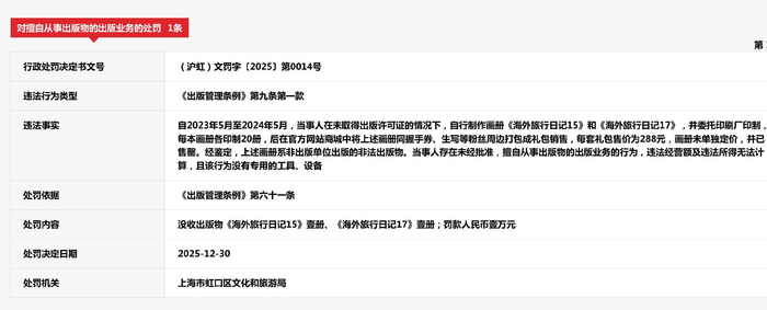 违法事实显示,自2023年5月至2024年5月,当事人在未取得出版许可证的情况下,自行制作画册《海外旅行日记15》和《海外旅行日记17》,并委托印刷厂印制,每本画册各印制20册,后在官方网站商城中将上述画册同握手券、生写等粉丝周边打包成礼包销售,每套礼包售价为288元,画册未单独定价,并已售罄。经鉴定,上述画册系非出版单位出版的非法出版物。当事人存在未经批准,擅自从事出版物的出版业务的行为。