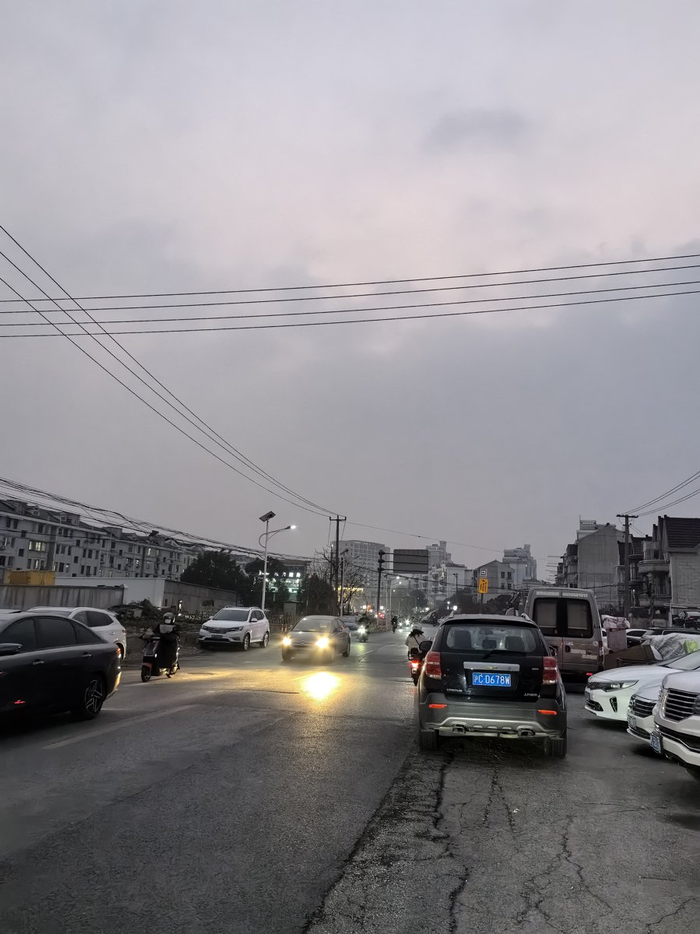 路面布满龟裂纹,频繁的修补留下了大量高低起伏的黑色补丁。