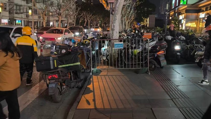 1月14日中午,记者来到杨浦区五角场商圈。合生汇商场南侧3号门附近,商场内部通道出口与安波路连接处,用金属牌和绳索围成了一块方形区域,专门设置成外卖车辆临时停放点。然而这个区域仅可停放约20辆电瓶车,一些社会电瓶车辆和少量外卖电瓶车早已塞满了这个小型停车区。新到的外卖骑手只能将车子停在区域外的路边。