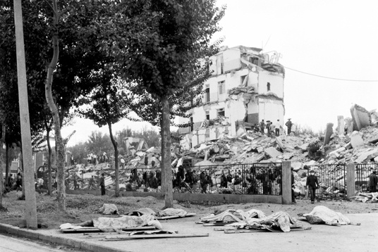 烟尘、煤土漫天的唐山黎明,还有一具具尸体挂在危楼上,一个个活人挂在危楼上慢慢变成尸体。