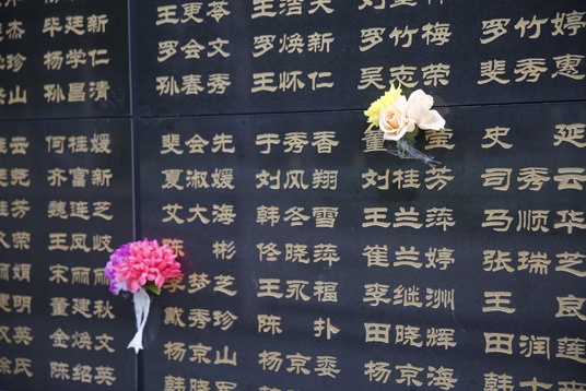 女儿的名字刻在纪念墙上,一块砖上有40个名字,他老了,眼睛不好使了。