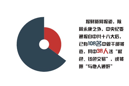 据财新消息,除周永康之外,中央纪委通报自中共十八大后,有108名中管干部被查,其中38人涉“权色、钱色交易”,或被曝“与他人通奸”。也有相关机构得出落马官员一半以上都与情人有关。