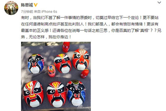 好友纷纷为王宝强发声,陈思诚挺王宝强微博截图
