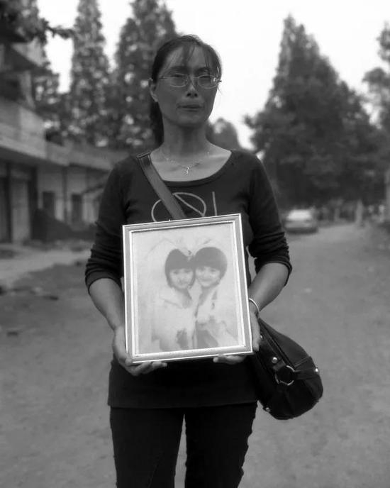 一个妇女抱着相框,照片上是两个女孩子,她如此得悲伤。我过去说希望给她拍照片,拍了几张后,低声问了她名字,她叫赵德琴,照片中的女孩叫赵雅佳和赵雅琦。在别人悲伤时刻打扰别人是很不舒服的,但我想还是要把这个拍下来。