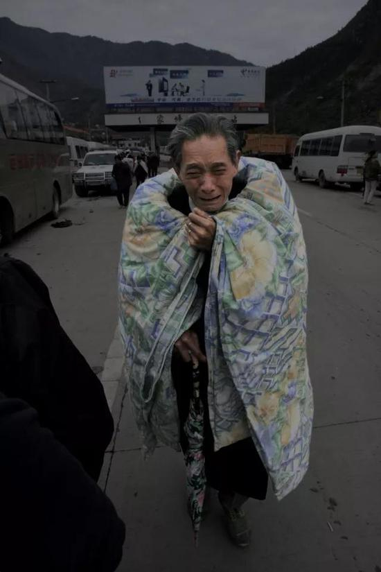 在向外走的人流中,还有一些是在灾难发生后冒险重回已成废墟的家中挖掘可用物品的人,他们背着或抱着一些日用品,要去寻找新的居住地。这位披着棉被的老人,他也刚从北川县城里走出来,正在前往他的新的居住地一一灾民临时安置点,我和他擦肩而过,来不及有任何的交流,按下快门后,回荡在耳边的是他伤心的哭泣声。