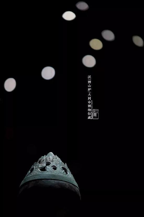 A:关于局部的细节拍摄,其实就是自己慢慢琢磨。我会绕着这个展品多走两圈,站着、半蹲、蹲下,甚至趴着、躺着,各种姿势我都尝试过。也会从各个角度观察文物,看看有没有一些不太常见的构图。当我以这种思路来看文物的时候,确实就能发现一些匆匆而过、不易察觉的细节。比如大同市博物馆有一件博山炉,一般的观众都只从正面拍摄。当时我就蹲下来,把博山炉的炉顶当作是浮在黑暗里的一座仙山,把展厅上面的灯光当作繁星,形成了一张富有画面感的图片。