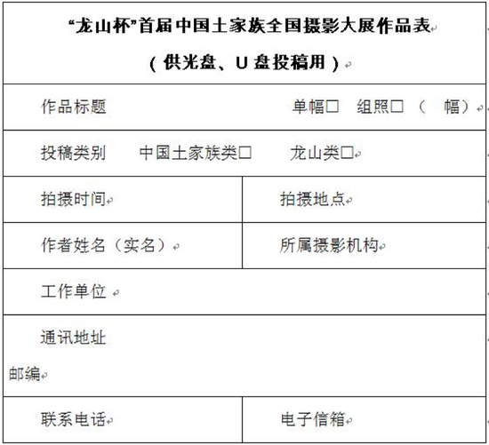投稿作品以光盘(CD-R或DVD-R)、U盘存储形式邮寄至:北京市东城区东四十二条48号中国摄影报社“龙山杯”首届中国土家族全国摄影大展办公室收(100007)