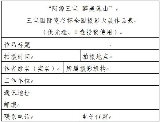 官方网站:作者可在诠摄汇网“参展”专区(dz.cppfoto.com)“三宝国际瓷谷杯全国摄影大展”中注册,并按要求填写真实个人信息后上传作品。主办单位保证不公开或泄露投稿个人非公开信息。投稿作品为JPG格式,图片统一处理为长边600—1000像素,文件大小控制在500KB以内。工作人员将对投稿作品进行初步形式审核,符合要求的作品将呈现于大展官方网站的作品列表中。