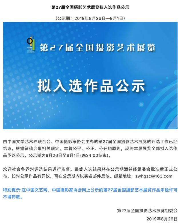 由中国文学艺术界联合会、中国摄影家协会主办的第27届全国摄影艺术展览(国展)拟入选作品于2019年8月26日公示,9月1日晚24:00结束。本届国展纪录类单幅共有69幅作品拟入选,其中3名来自新浪爱拍“生于街头”的摄影师杨军 @镜视眼88、樊丽勇 @飞镖、王维宇 @远去的帆影 均有一幅作品入选。另外新浪爱拍“你好世界”摄影师邵小峰、王国辰也均有作品入选。