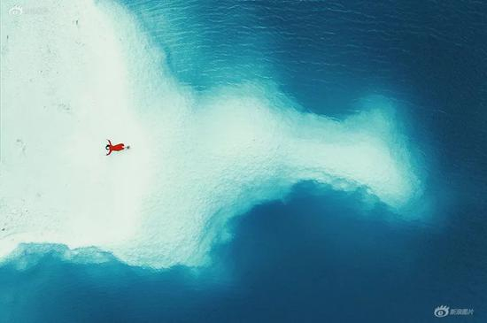 纯净的盐湖上,一名红衣女子躺在如冰的岸边,俯瞰之下唯美惊艳。