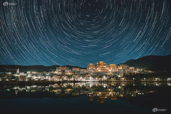零下10度的天气,在拉姆央措湖旁瑟瑟发抖的拍摄了俩小时,用低机位把远处的松赞林寺和星轨拍摄下来。