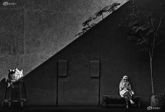 一名女子座在景区内的长椅上着看手机,她身后的墙面上一道斜影破空划下,让这里变得景致不同。