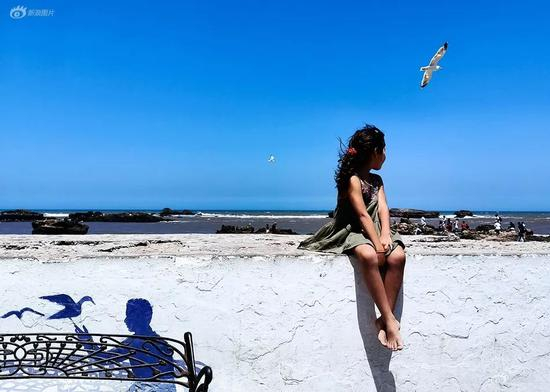 一名女孩坐在海边的矮墙上回望远处的大海,一只海鸟飞过与墙面上的绘画恰巧形成呼应。