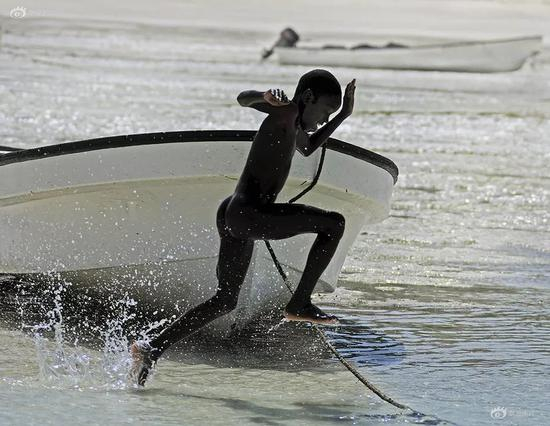 坦桑尼亚桑给巴尔岛海边,一名赤身裸体的男孩正奔向海水中玩耍。