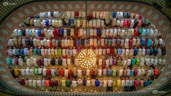 孟加拉宰牲节期间,信徒们在达卡清真寺内进行祈祷。