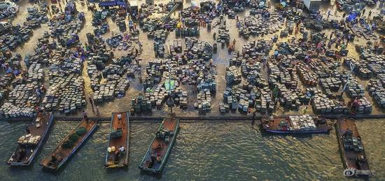 清晨的码头上,堆满了渔民们刚收获的新鲜鱼获,景象一片热闹繁忙。