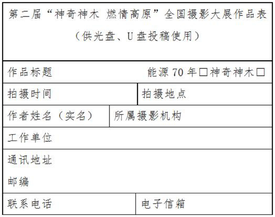 投稿作品以光盘(CD-R或DVD-R)、U盘存储形式邮寄至:北京市东城区东四十二条48号中国摄影报社 第二届“神奇神木 燃情高原”全国摄影大展办公室收(100007)