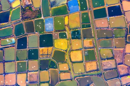 《大地调色板》 摄影:黑狼的微博 桑基鱼塘是珠江三角洲地区,为充分利用土地而创造的一种高效人工生态系统。从高空鸟瞰广东佛山西樵的桑基鱼塘,有如大地调色板般的神奇和美丽。