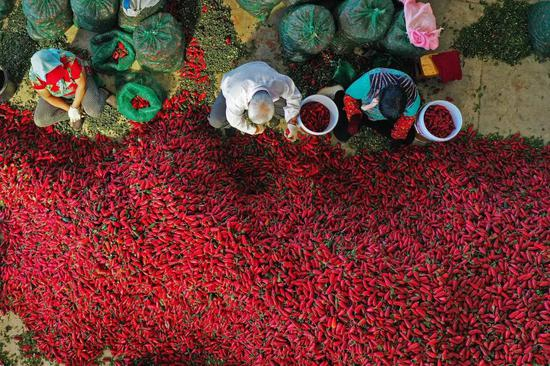 《火红辣椒映丰收》 摄影:思穹无痕_74286 2019年9月5日,甘肃省高台县宣化镇生态农业发展合作社的冷库大棚下,300多名农民工正在精选采摘的辣椒,火红的辣椒堆积如山,现场一派热火朝天的繁忙景象。