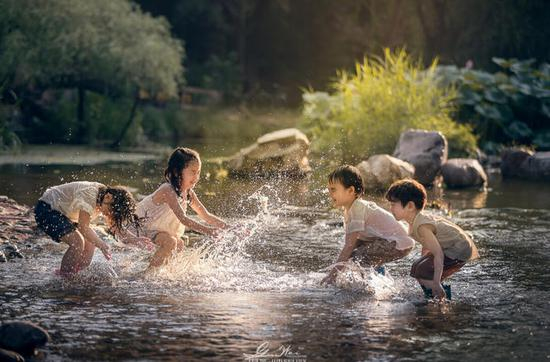 “捕捉到了孩子们尽情玩耍的欢乐时光。构图很棒,我的眼睛被图片中央的水珠吸引,然后是每个孩子的脸,再注意到用光。对光线和景深的控制很到位。”(图虫摄影师@摄影师鬼微)