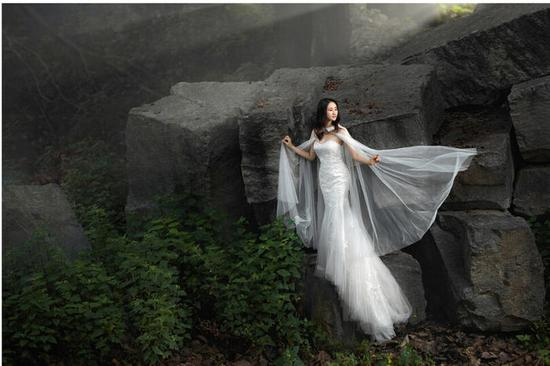 “很棒的创意,恰到好处的光线控制。人物动作,烟的层次形状相得益彰,下方大面积三角形婚纱在视觉上做为“底座”托起人物主体,使主体稳定的同时,也作为引导线进一步将观众的注意力集中到主体人物身上。”(图虫摄影师@RyanQin)