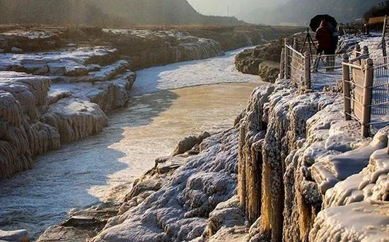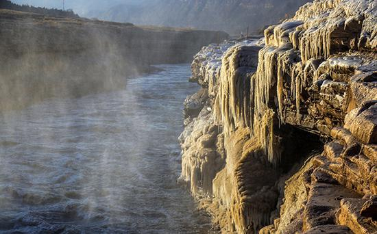 壶口瀑布四季皆盛景,唯冬景最为颠覆眼球。相比游人如织的春、夏、秋,冬季时壶口瀑布进入一年中的“静寂期”,岸崖冰挂的褶皱深处,藏着“她”百万年来的心事,上升的水汽随风飘荡、升起降落,四周笼罩上玻璃般的冰晶,置身“星际穿越”外星奇景里,让往来游客体验到夺目的冰瀑奇观。