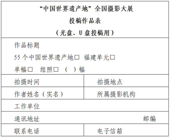 投稿作品以光盘(CD-R或DVD-R)、U盘存储形式邮寄至:北京市东城区东四十二条48号中国摄影报社活动项目部 “中国世界遗产地”全国摄影大展办公室收(100007)