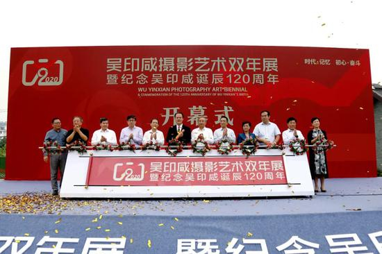 9月21日,第二届吴印咸摄影艺术双年展暨纪念吴印咸诞辰120周年活动在江苏省沭阳县吴印咸故居开幕。图为与会领导嘉宾共同启动开幕式。