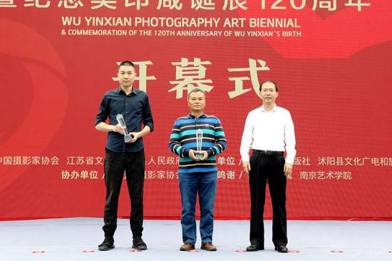 9月21日,第二届吴印咸摄影艺术双年展暨纪念吴印咸诞辰120周年活动在江苏省沭阳县吴印咸故居开幕。图为沭阳县委副书记、县长彭伟为获得“摄影教育资助”代表颁发纪念杯。