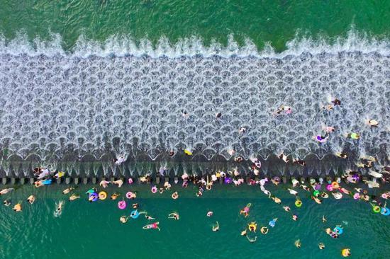 2019年7月23日,农历节气大暑,浙江省宁波市余姚陆埠镇撞钟山的“龙鳞坝”,亲水的人们享受纳凉时光。