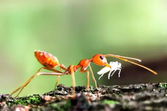 在观察一群蚂蚁捕食时,一只小蚂蚁非常灵活,很快就捕捉到了一只很小的虫子,飞快地往洞穴方向跑,于是我赶紧抓拍。