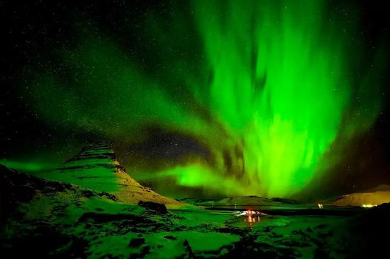 2019年3月7日,拍摄于冰岛斯奈山半岛草帽山。我随谢墨老师来到这里,皑皑白雪覆盖下的草帽山和冰瀑是那样的美丽动人。傍晚,导游通知极光预报21时到凌晨一点为活跃期,我们住在离草帽山一个多小时车程的小镇,22时许,我与同团的两位摄友驾车来到草帽山,我独自一人穿好冰爪肩负器材向山上攀爬到合适的位置,拍下了这张以草帽山为前景的草帽山北极光。