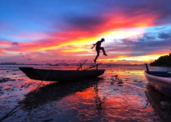 黄昏时分,一小伙子站在海边船头上一跃而起。