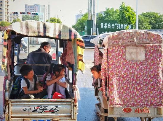 早晨上学的路上,在等红绿灯时碰到了同学说点有趣的事,爷爷也侧身想听听。