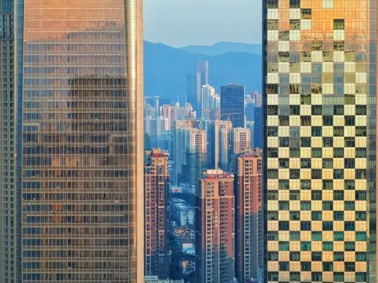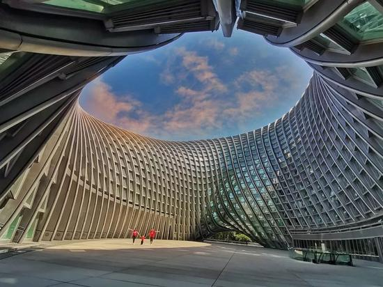 使用华为P30拍摄于福建,透过两栋大楼间的城市印象。