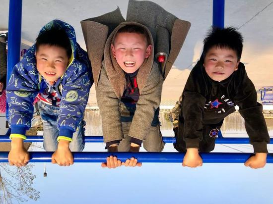 2019年3月31日,使用iPhone8拍摄于河南焦作。在村里的小广场上,拍下了在双杠上玩倒挂的三个男孩,经过后期旋转后发现更有趣。