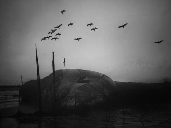 2019年4月9日,乐清湾胜利塘,天色阴沉,海风阵阵,吹鼓渔民撒布的旧网,群鹭掠过,更添几分萧瑟。