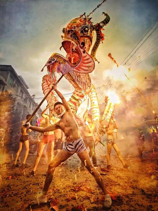 该手机摄影作品入选2019年第八届大理国际影会,以高3米宽2米的巨幅图片参展,这是难忘其一;该作品的拍摄经历是难忘其二:因为第一次拍摄炸龙,鞭炮烟火在头上、身边乱炸,衣服上能明显的看到被鞭炮烟火烧灼的小洞,拍摄的我冒雨追随炸龙的队伍,穿梭在围观的人潮中寻找拍摄角度,边跑边拍,于是拍到了这幅作品。历时六个多小时的拍摄经历令人难忘。