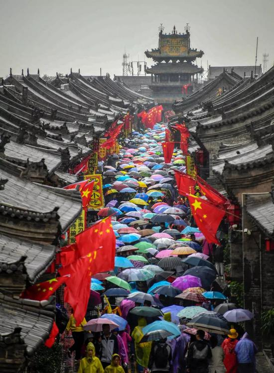 2019年10月4日下午两点半左右,平遥古城秋雨绵绵,我打伞登上城墙,明清街上各种雨伞覆盖整个街道,国旗点缀其间,与古建筑相映,构成一幅美丽的秋雨古城图,十分震撼。而那彩色的流动的雨伞,也反映了游客的游兴正浓。我不顾雨伞被吹跑,冒雨拍下了这张照片。送给自己的一句话:摄影人,风雨兼程。
