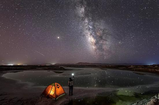 大柴旦的星空璀璨夺目,英仙座流星雨当晚在这里落下,与星辰大海争辉。