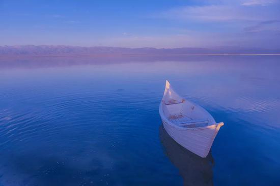 一只白色的小船静静的漂流在美丽的盐湖之上。
