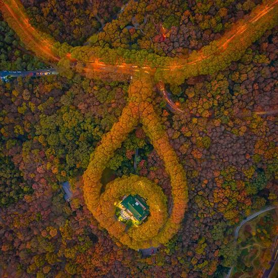 南京美龄宫是世界闻名的美丽景点,秋季傍晚时分,此时的钟山秋林色彩奇幻,梧桐大道和美龄宫环线路在路灯映衬下有如金色项链一般,美龄宫正殿如一颗碧玉镶嵌在项链之上。