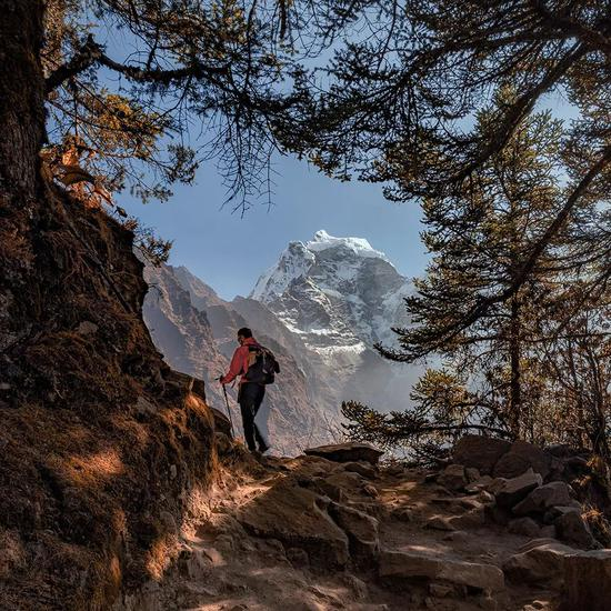 在尼泊尔萨珈玛塔国家公园通往珠峰大本营的山路上,一位徒步旅行者正在翻越一座山丘。