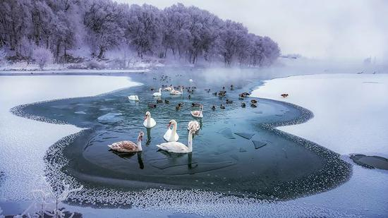零下三十度的严寒,天鹅和水鸟们聚集在狭窄的水域里和睦相处。