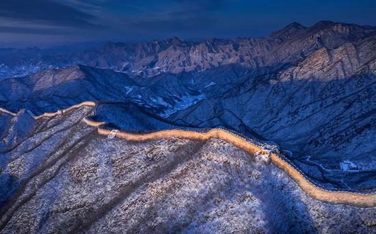 箭扣长城西大墙段,在晨光中展露出金色迷人的身姿,像一条巨龙,游弋在蜿蜒起伏的山脊之上,美不胜收。