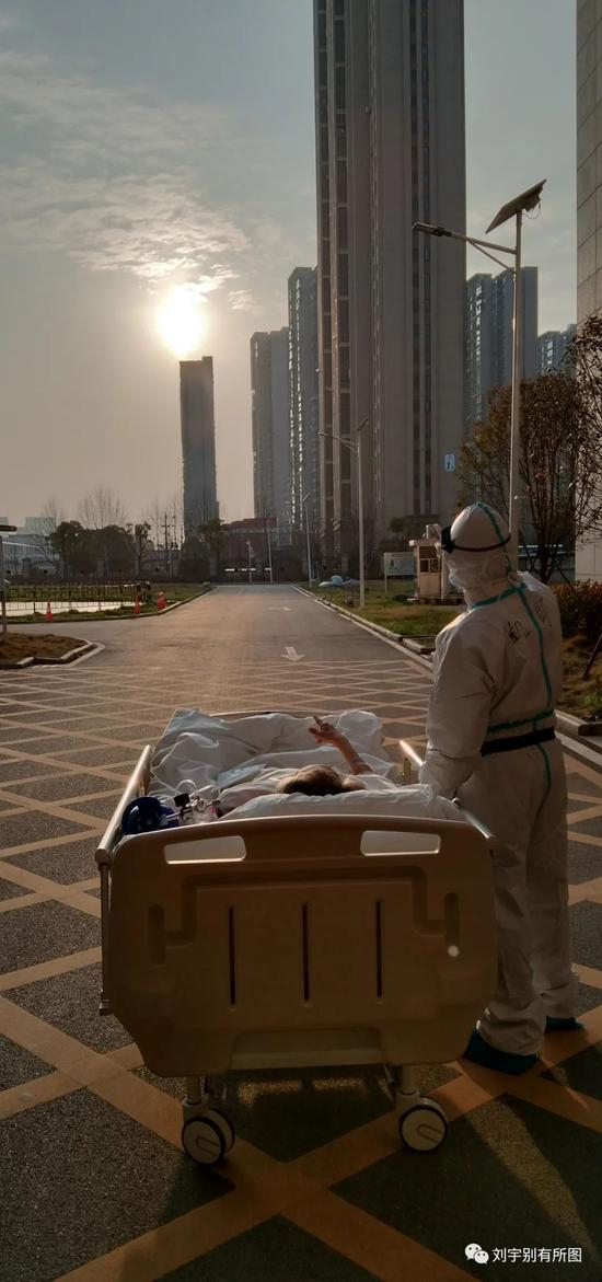 “武汉大学人民医院东院,复旦大学附属中山医院援鄂医疗队队员刘凯护送病人做CT的途中,停了下来,让已经住院近一个月的87岁老先生欣赏了一次久违的日落。落日余晖下的两个身影,令人动容”。 甘俊超 摄 文字据《长江日报》 刘凯提供照片