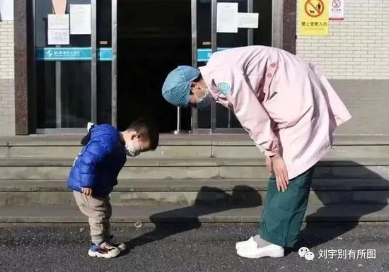 2月22日,3岁小男孩在浙江省绍兴市中心医院感染三病区出院时,与护士长曹玲玲鞠躬致谢,曹护士长随即也向小男孩鞠躬致意。这感人的一幕刚好被她的同事记录了下来。该男孩于2月19日发烧住院治疗,后经核酸检测为阴性。曹玲玲称,见男孩先鞠躬,很是惊讶和感动,遂鞠躬回礼。傅金可 摄 文字据《中国青年报》 图片来自网络